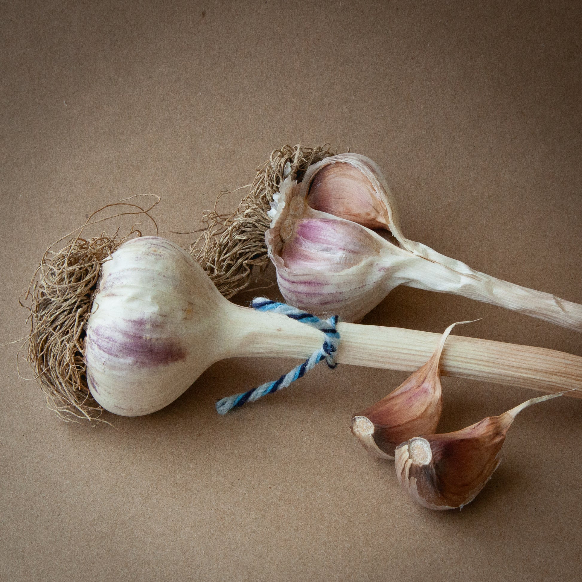This Guatemalan Ikeda garlic is a Purple Stripe variety. After 4 years of bulbil production it is now established and producing some very tasty bulbs. Dark red and tan coloured cloves tightly wrapped in a medium sized tan bulb. It is not a large plant but does produce a decent size scapes. Harvest is late like most purple stripe varieties. GU with a blue and white string